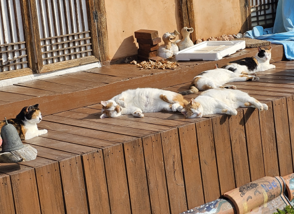 2024년, 마당에는 다시 새 생명이 찾아왔다. 미투(아래 사진 맨 왼쪽), 코순이(아래 사진 두 번째), 비통이(아래 사진 세 번째). 이 세 아이의 탄생으로 마당의 질서는 또 한 번 달라지기 시작했다. 미투는 치즈색 털을 가진 아이였다. 미래와 너무 닮아 있어 자연스럽게 **‘미투’**라는 이름을 붙였다. 아직 확실하진 않지만, 아마도 아빠는 미래가 아니었을까 조심스레 짐작해 본다. 삼색 고양이인 코순이와 비통이는 양이가 낳은 새끼들이다. 코순이는 코에 선명한 검은 점이 박혀 있어 단번에 눈에 들어왔고, 비통이는 얼굴 무늬가 꼭 명품 브랜드 루이비통을 닮아 그렇게 이름이 붙었다.